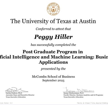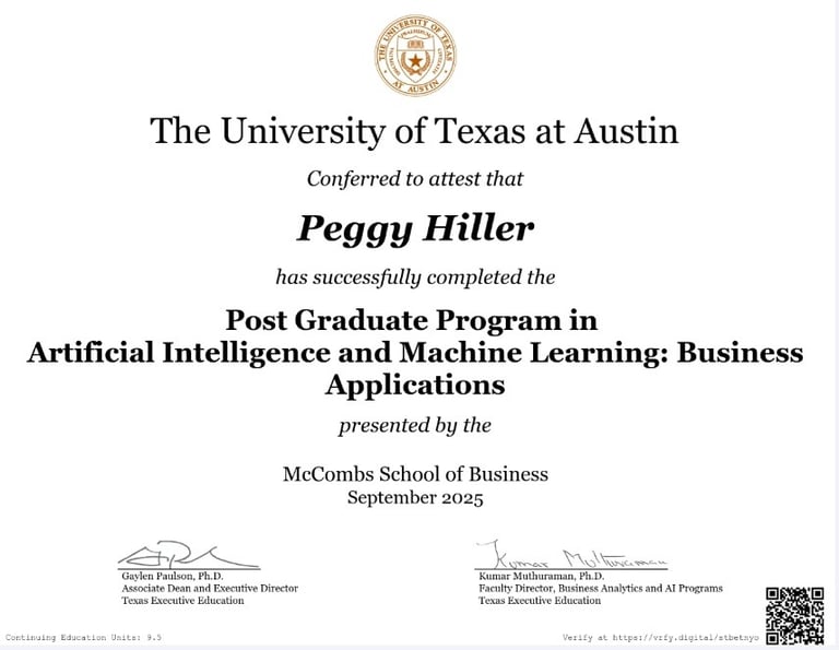 Peggy Hiller serves as a catalyst for intelligent organizational transformation—helping leaders align people, purpose, and AI to create more meaningful, efficient, and human-centered organizations.